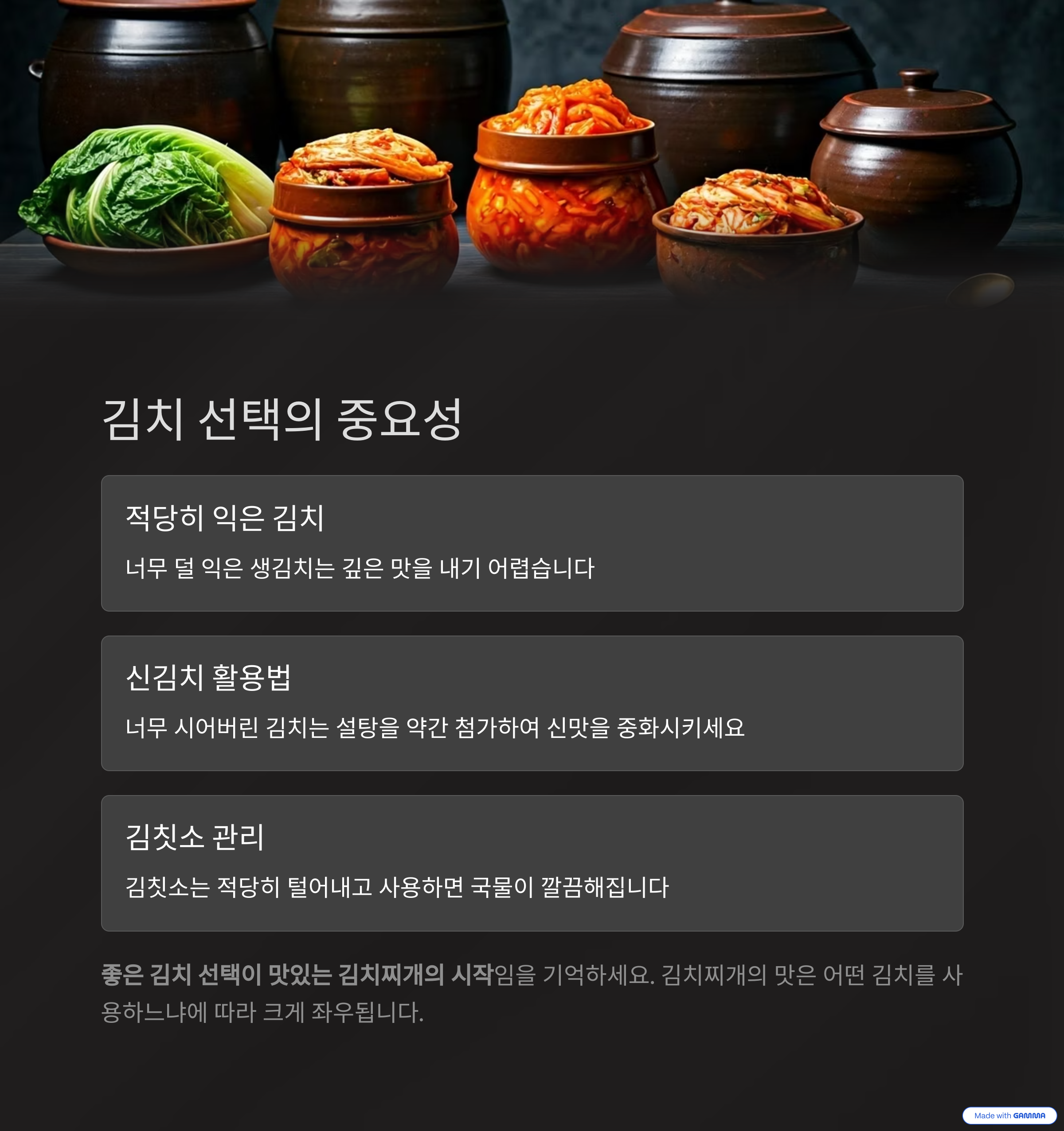 | 설탕/매실액 | 김치의 신맛 중화, 감칠맛 | 김치의 신맛 정도에 따라 양 조절 필수 |