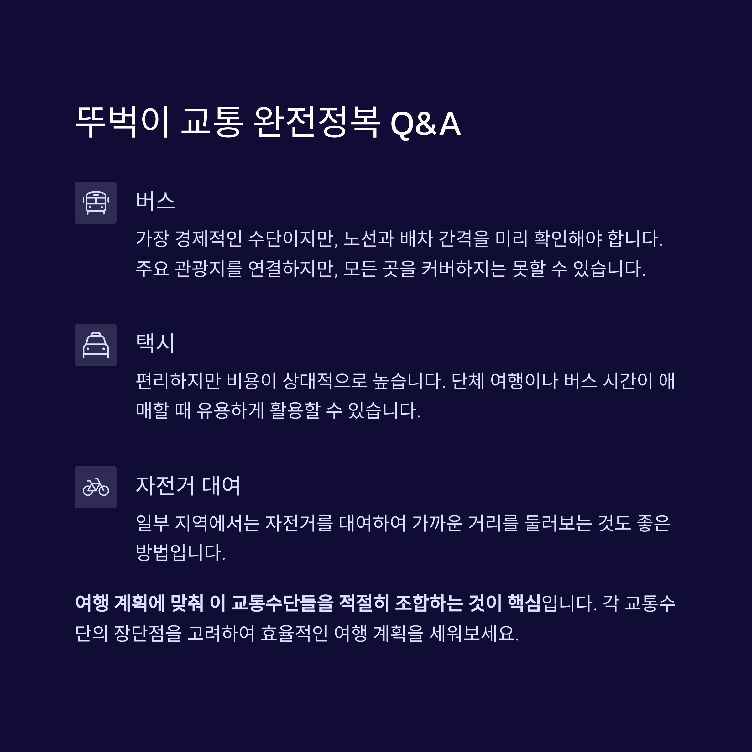 여행 계획에 맞춰 이 교통수단들을 적절히 조합하는 것이 핵심입니다.