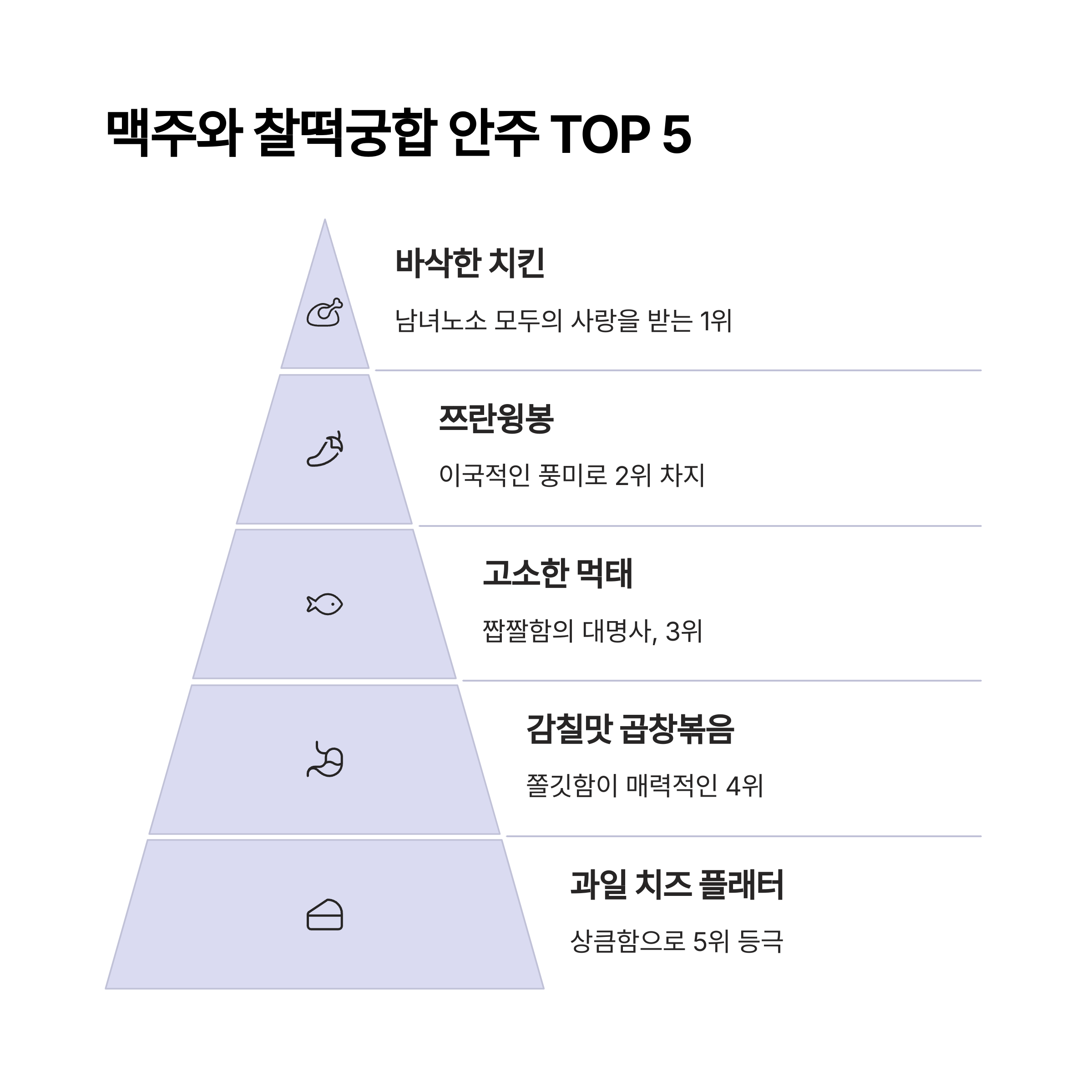 드디어 기다리고 기다리시던 순간입니다. 맥주와 환상의 궁합을 자랑하는 안주 다섯 가지를 지금부터 차례대로 공개하겠습니다. 첫 번째 주인공은 바로 남녀노소 모두가 사랑하는 바삭한 치킨입니다. 두 번째 자리는 매콤달콤한 양념이 일품인 떡볶이가 차지했습니다. 세 번째로는 고소함과 짭짤함이 조화로운 먹태를 선정했습니다. 네 번째 안주는 쫄깃한 식감과 감칠맛이 뛰어난 곱창볶음입니다. 그리고 마지막 다섯 번째는, 놀랍게도 신선한 과일과 치즈 플래터입니다. 각 안주의 중요한 매력은 맥주와의 조화입니다.