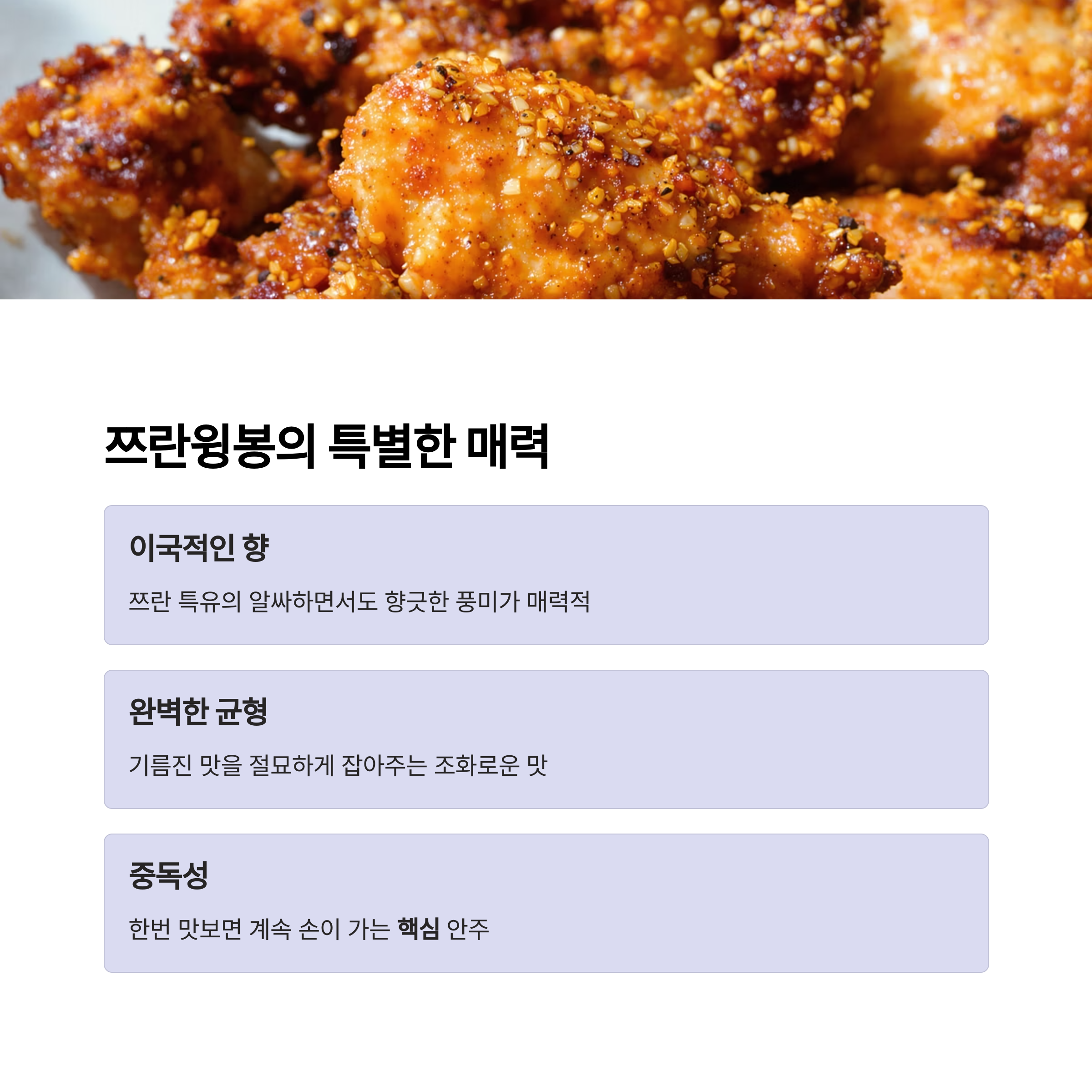 나: 얘들아, 요즘 쯔란윙봉이라고 들어봤니? 바삭하게 튀긴 닭날개에 쯔란 시즈닝을 뿌린 건데, 이게 또 맥주 도둑이라고 하더라고! 짭짤하면서도 이국적인 향이 맥주랑 그렇게 잘 어울린대. 오늘 저녁 핵심 메뉴로 어때?