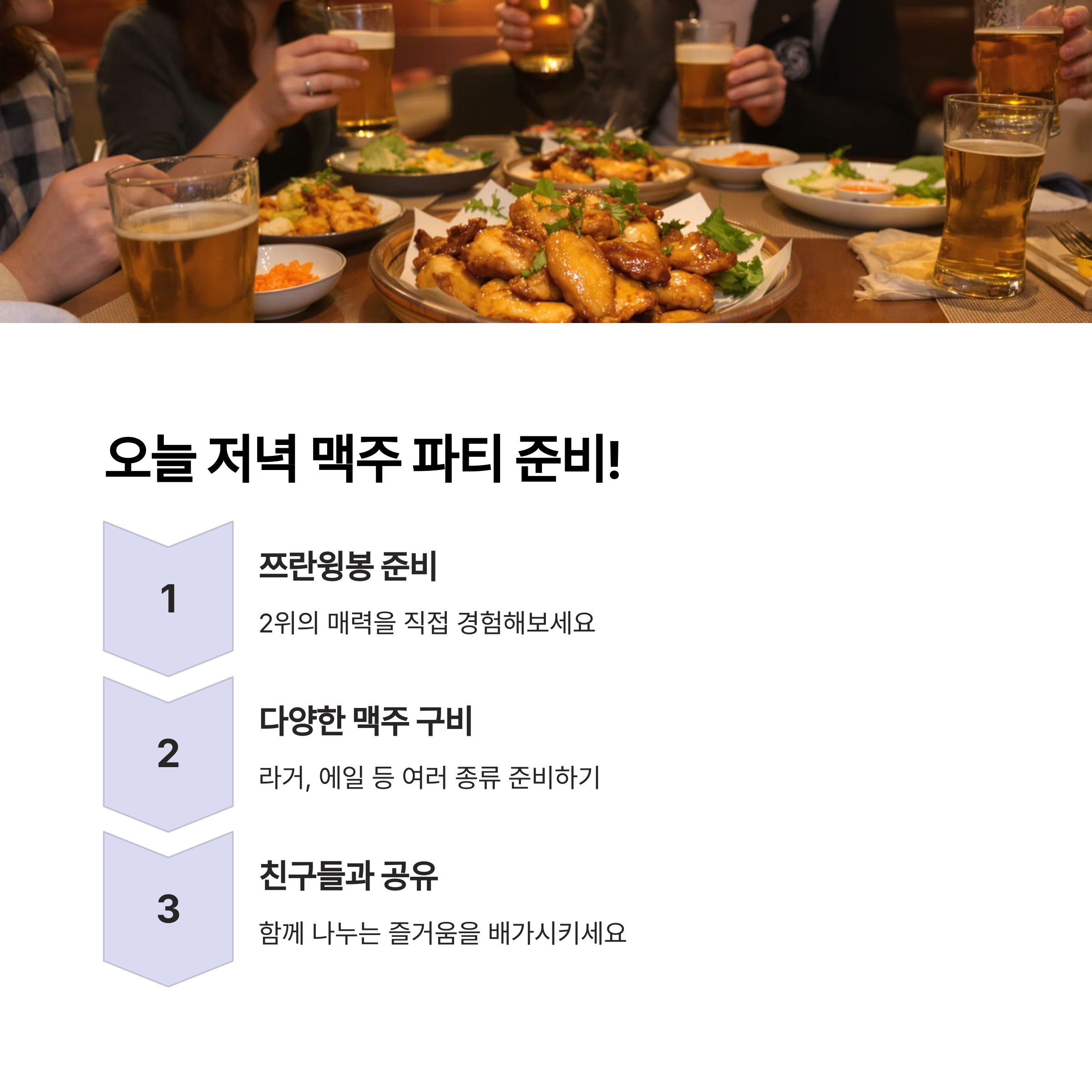 친구1: 오늘 저녁에 다 같이 모여서 시원하게 맥주 한잔하기로 했는데, 안주가 고민이네. 매번 먹던 것 말고 좀 새로운 거 없을까?