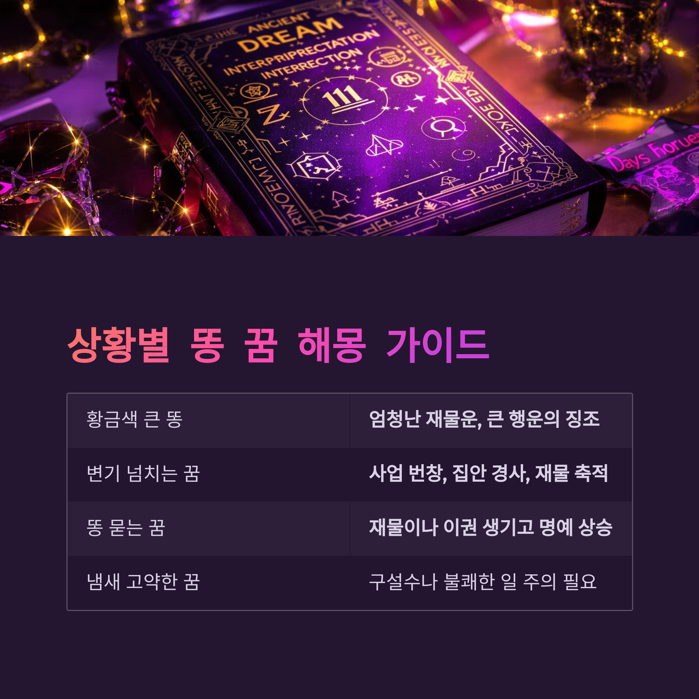다음은 몇 가지 대표적인 똥 꿈의 해몽을 표로 정리한 것입니다.