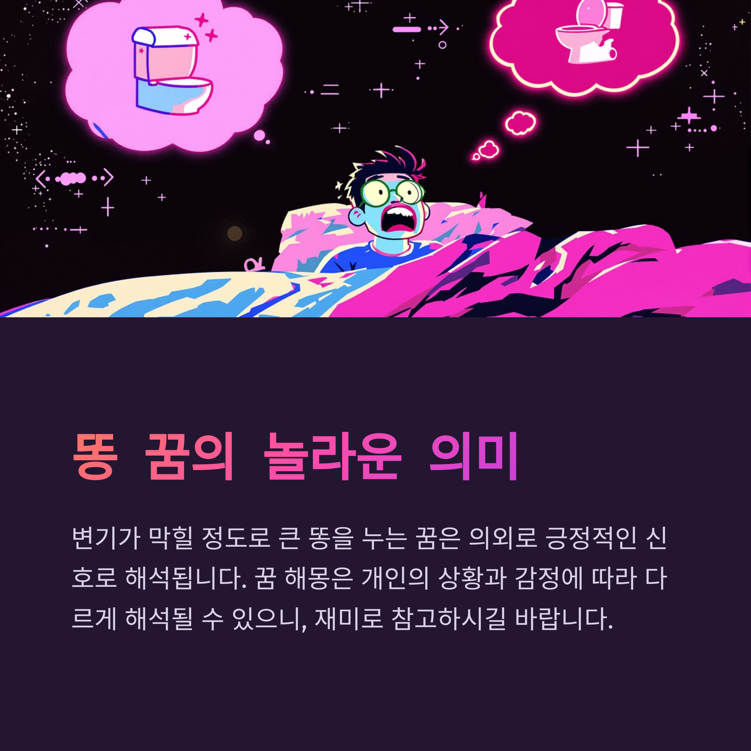 꿈에서 변기가 막힐 정도로 엄청난 양의 큰 똥을 누는 경험은 당황스러울 수 있지만, 해몽에서는 의외로 긍정적인 신호로 해석되는 경우가 많습니다.
