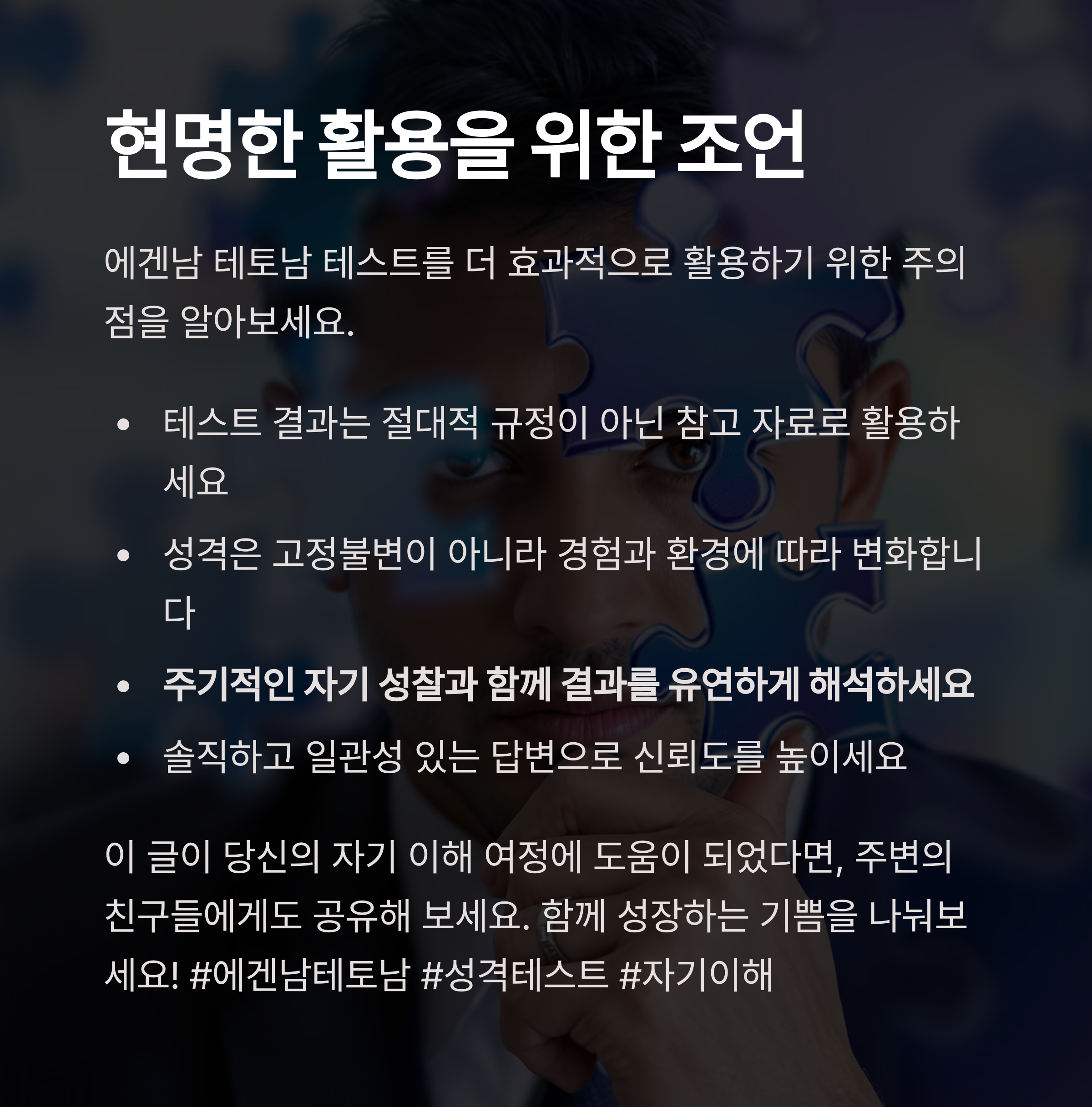 따라서 주기적인 자기 성찰과 함께 테스트 결과를 유연하게 해석하는 자세가 중요합니다.