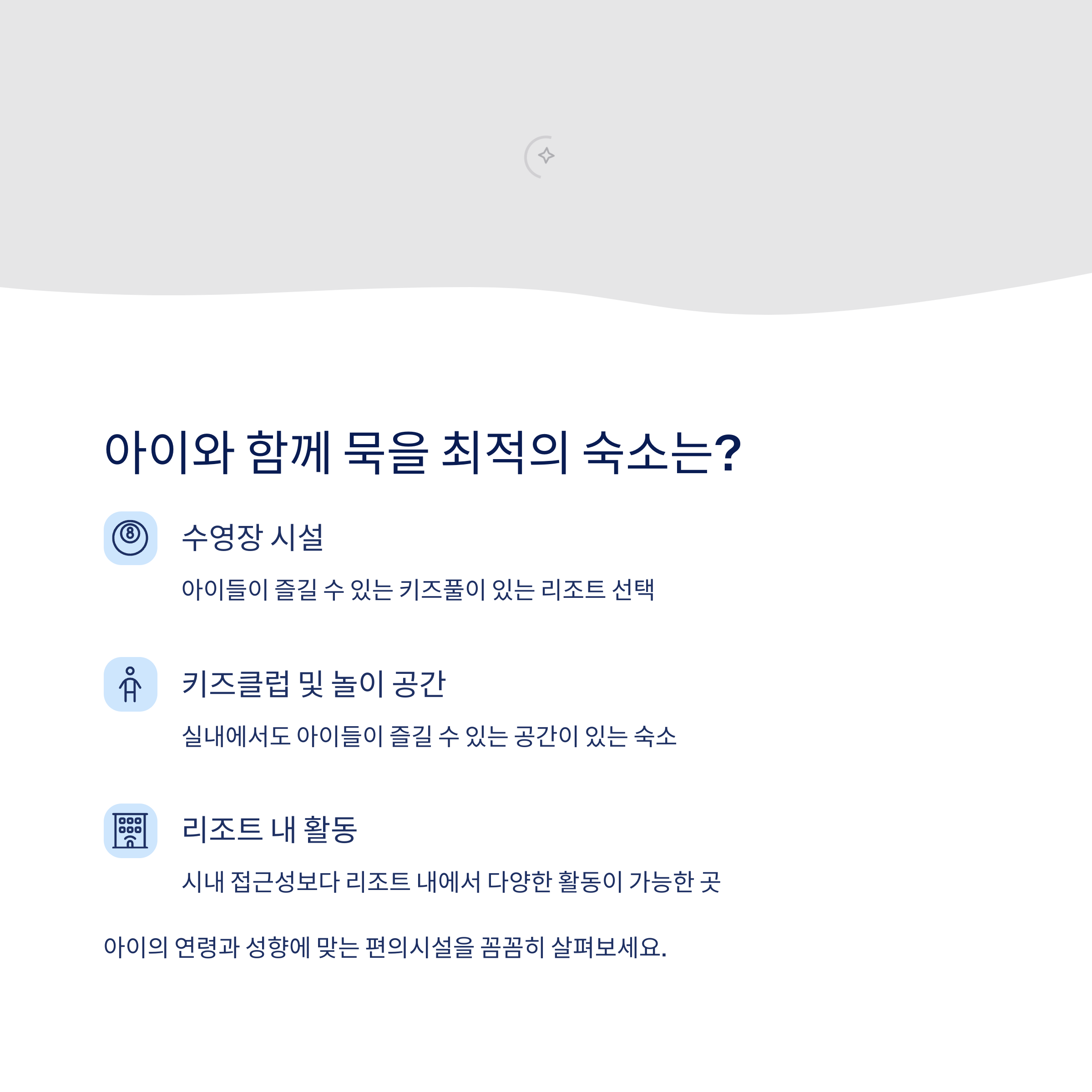 아이 동반 가족에게는 무엇보다 수영장 시설이 잘 갖춰져 있고, 키즈클럽이나 놀이 공간이 있는 리조트를 추천드립니다.