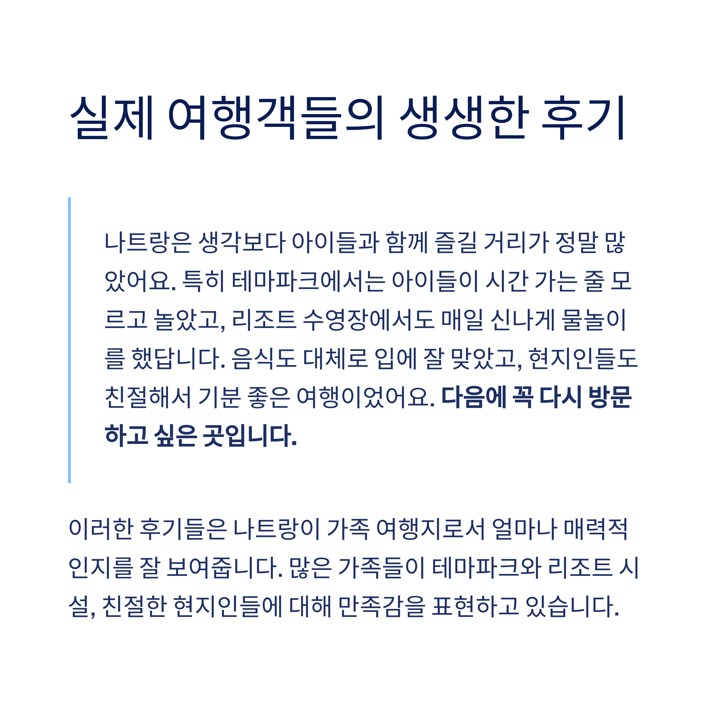 이러한 후기들은 나트랑이 가족 여행지로서 얼마나 매력적인지를 잘 보여줍니다.
