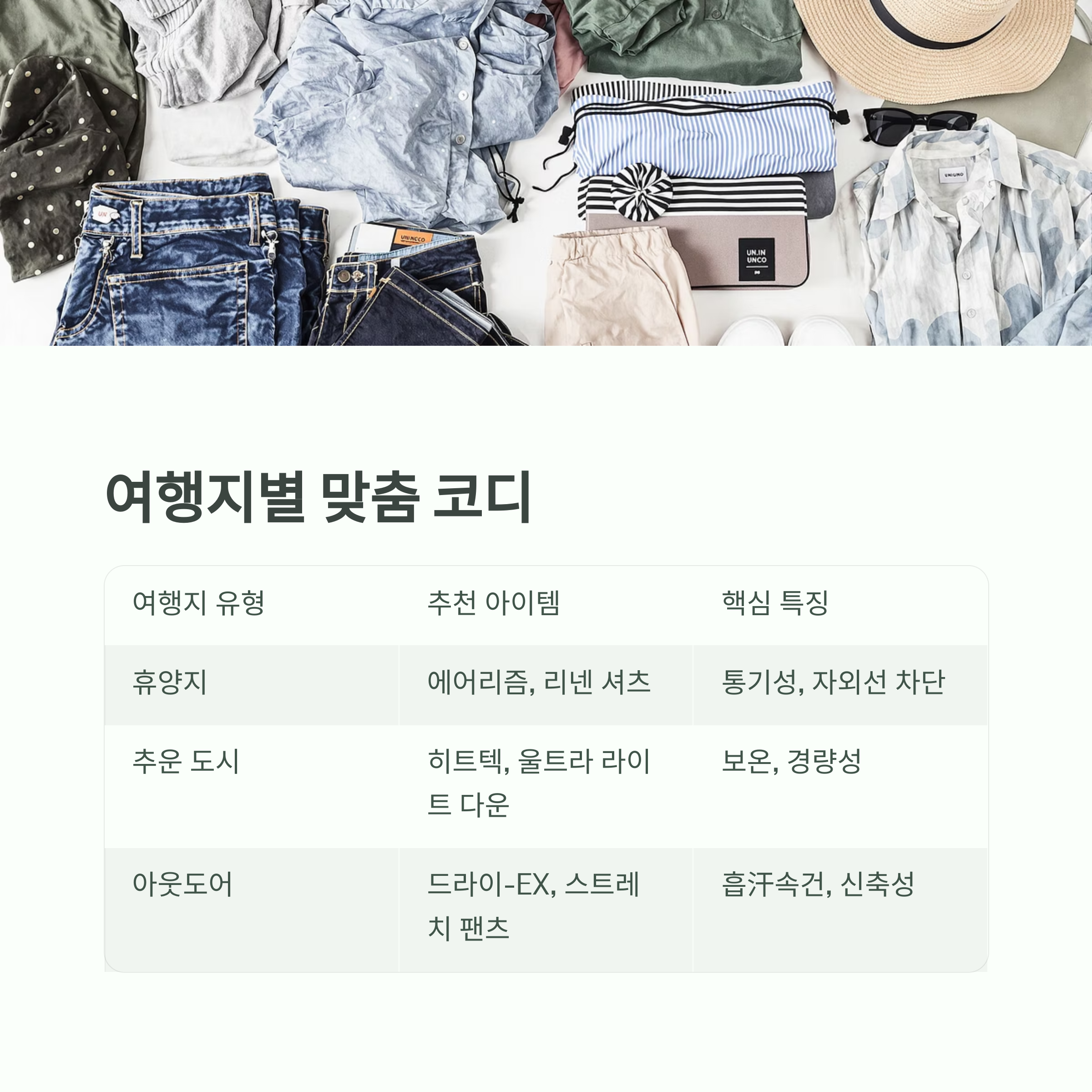 | 여행지 유형 | 추천 유니클로 아이템 | 핵심 기능 및 특징 |