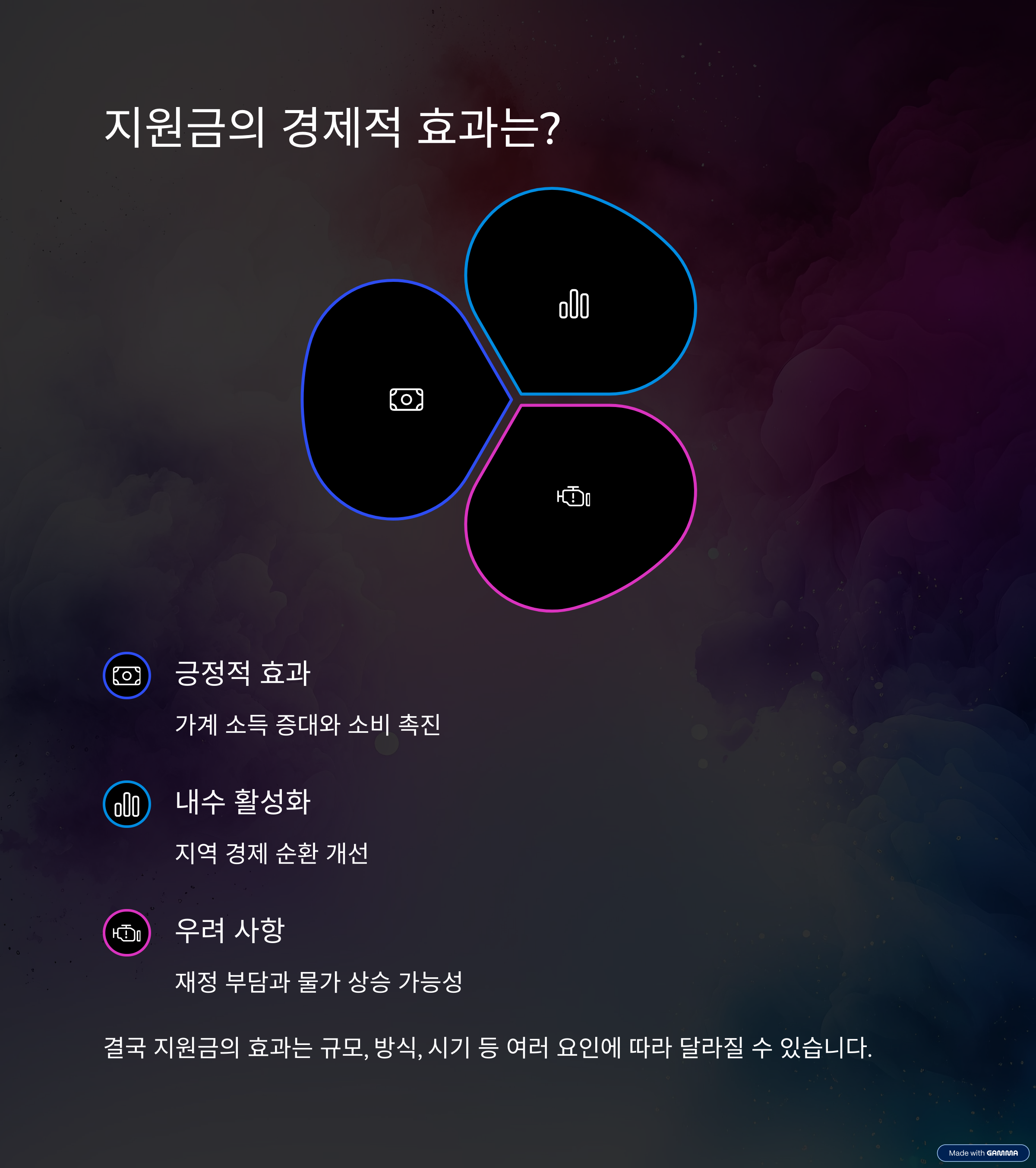 결국 지원금의 효과는 규모, 방식, 시기 등 여러 요인에 따라 달라질 수 있습니다.