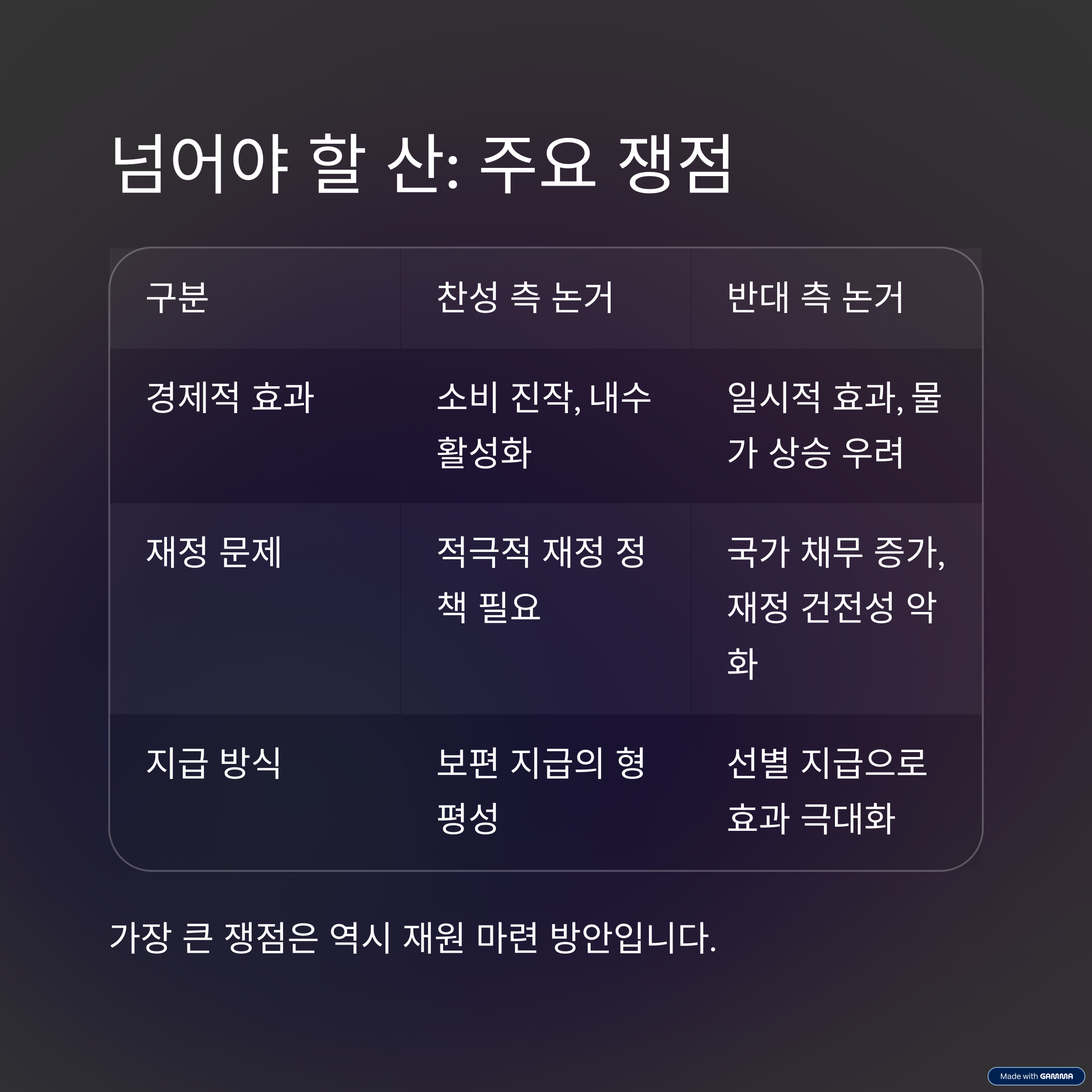 아래 표는 민생회복지원금 지급에 대한 주요 찬반 논거를 정리한 것입니다.