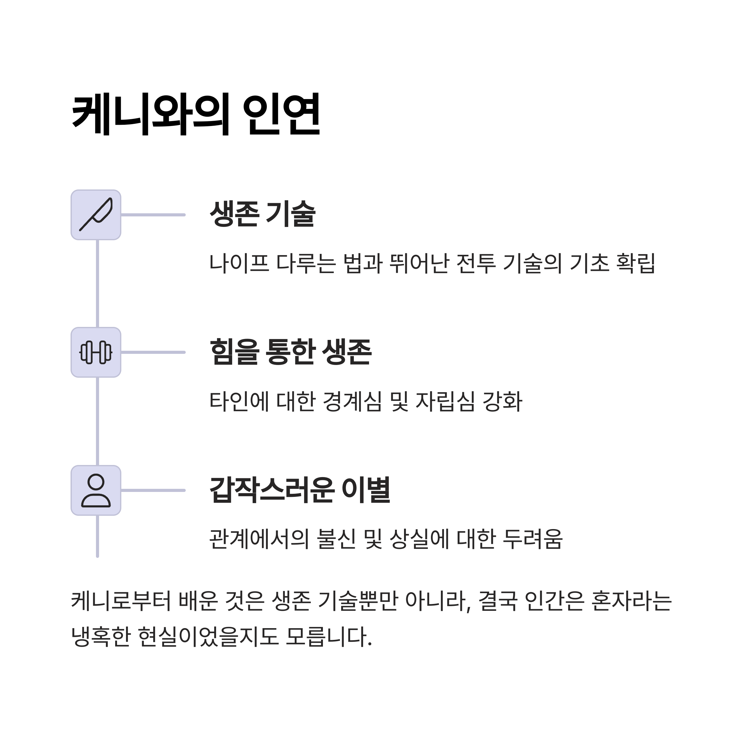| 힘을 통한 생존 방식 | 타인에 대한 경계심 및 자립심 강화 |