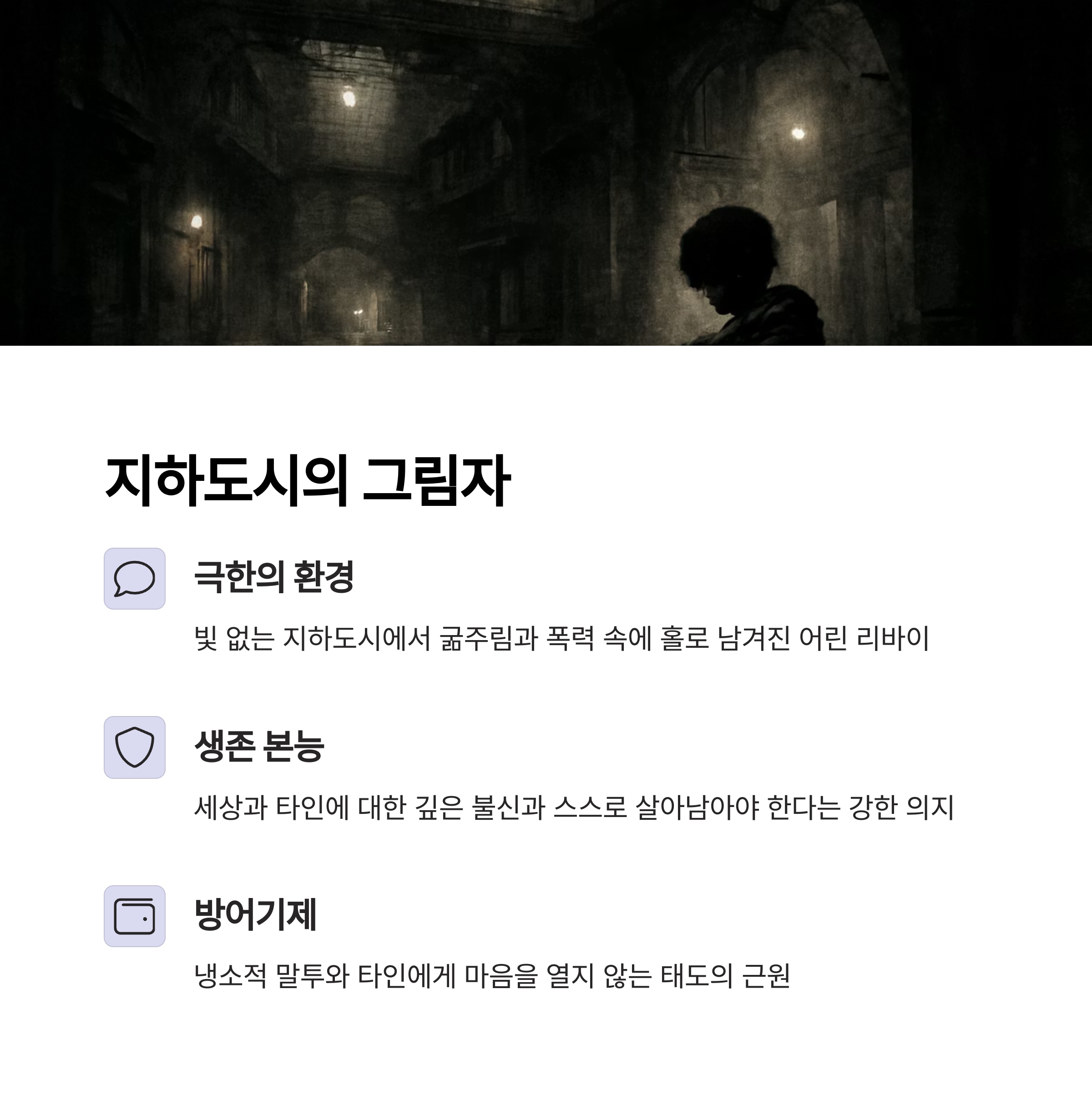 | 지하도시의 비참한 환경 | 극도의 결벽증, 냉소적 태도 | 불결함과 불안정으로부터 자신을 보호하려는 강한 방어기제 |