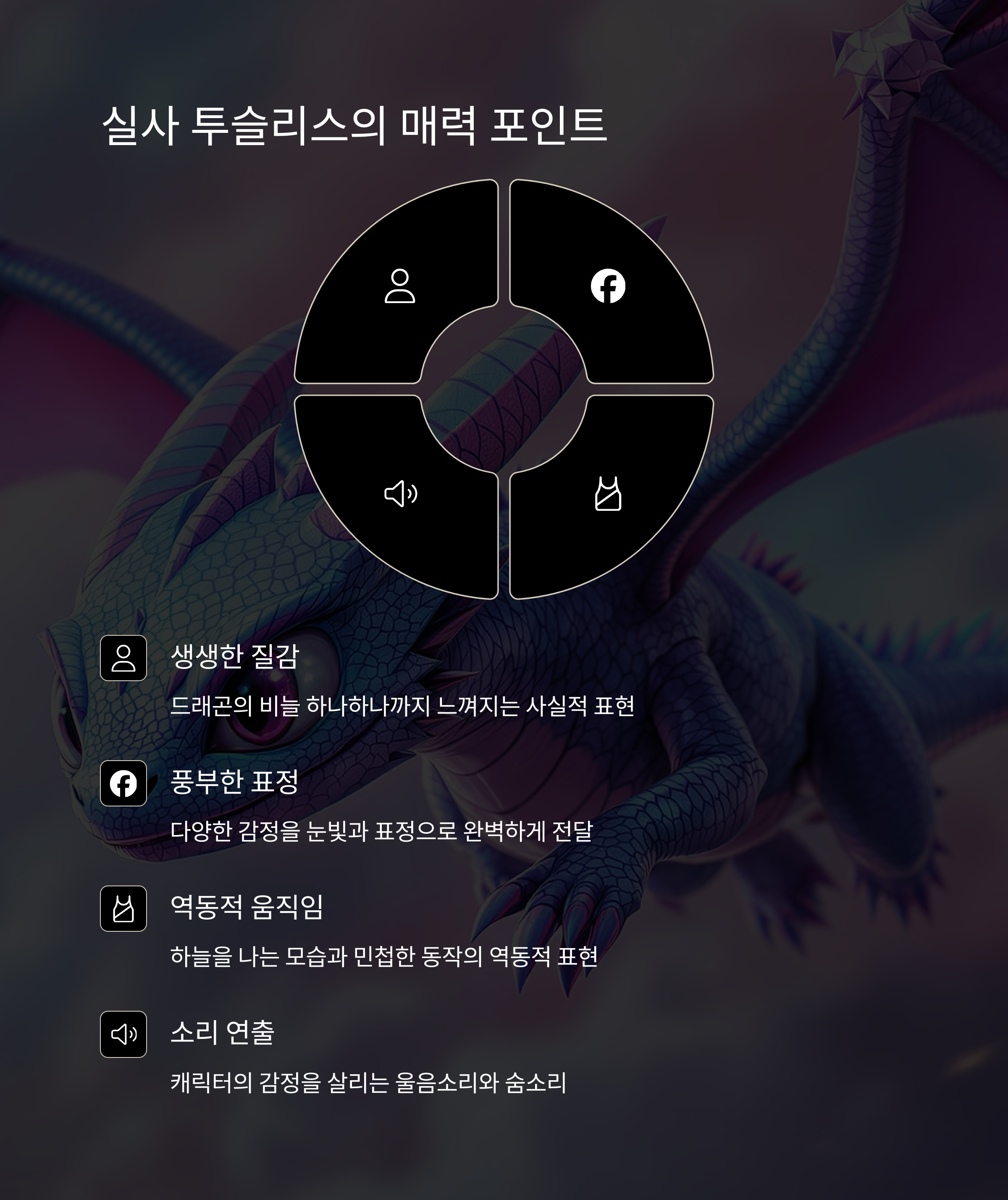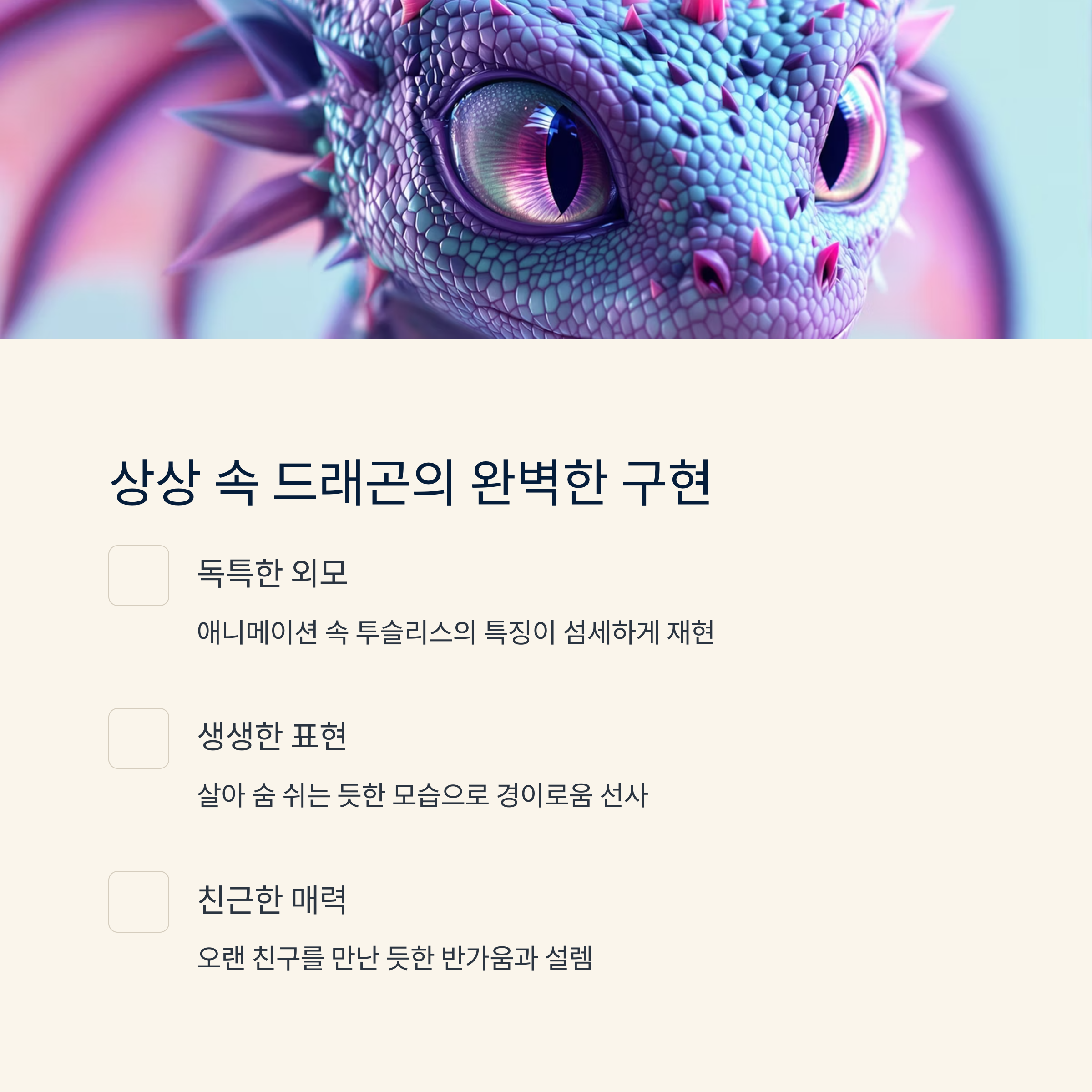 | 생생한 질감 표현 | 드래곤의 비늘 하나하나까지 느껴질 듯한 사실적인 질감이 돋보였습니다. |
