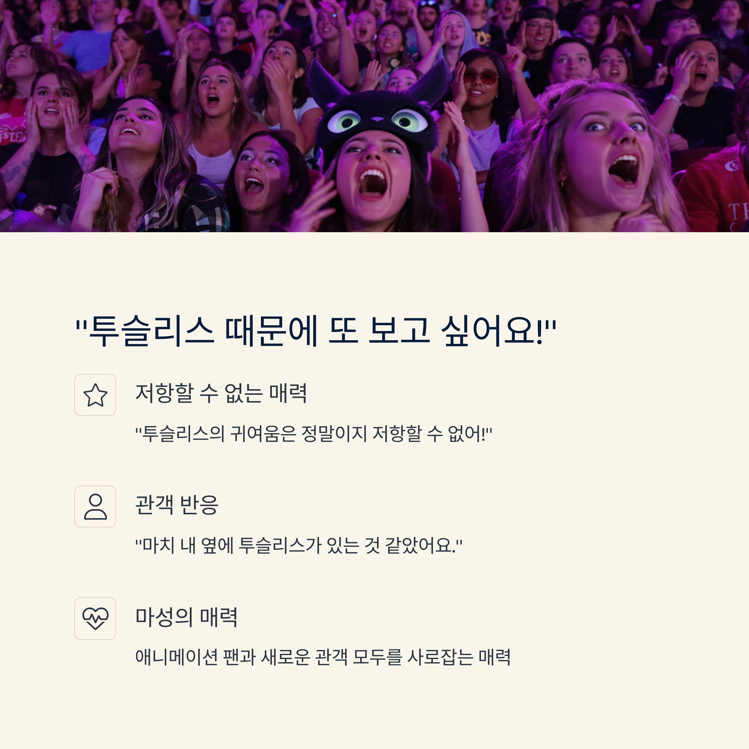 "투슬리스의 귀여움은 정말이지无法抗拒(저항할 수 없어)!" 라거나 "마치 내 옆에 투슬리스가 있는 것 같았어요." 같은 감탄사들이 여기저기서 터져 나왔습니다.